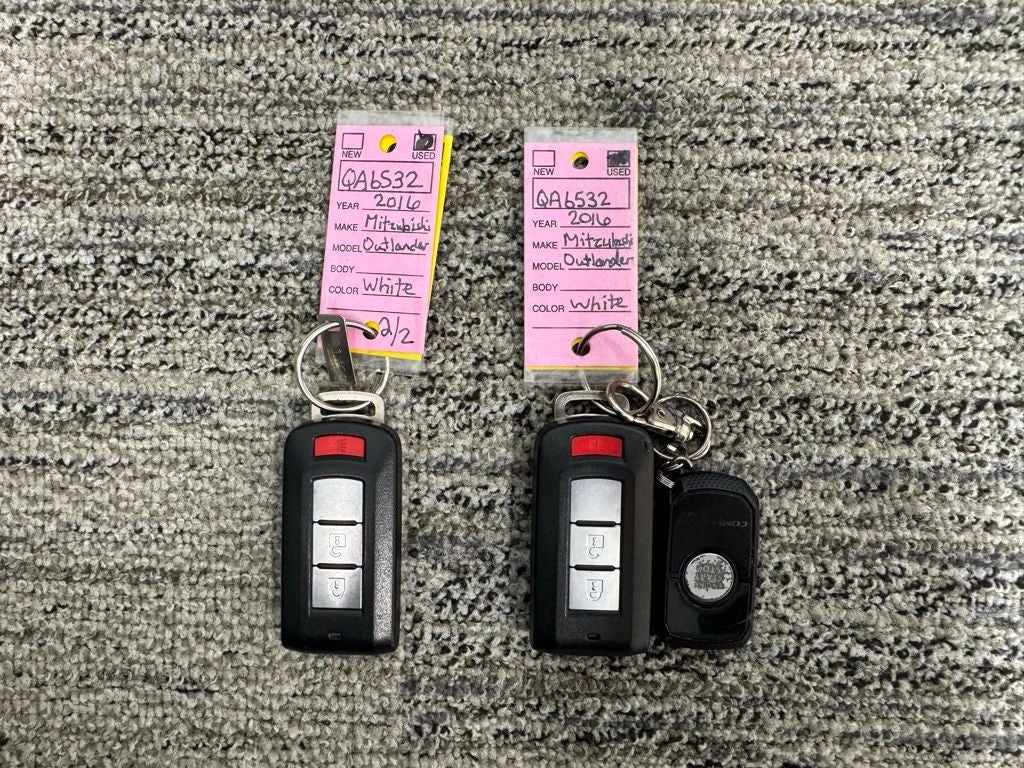 Recent Arrival! 2016 White Mitsubishi Outlander ES This Mitsubishi Outlander has many features and is well equipped including, Local Trade, Low Miles, New Brakes, 4WD, 4-Wheel Disc Brakes, Air Conditioning, Dual front impact airbags, Fabric Seat Trim, Front Bucket Seats, Power door mirrors, Power steering, Power windows, Radio: AM/FM Stereo w/CD/MP3/HD Radio, Rear window defroster, Remote keyless entry, Steering wheel mounted audio controls, Tilt steering wheel, Trip computer.