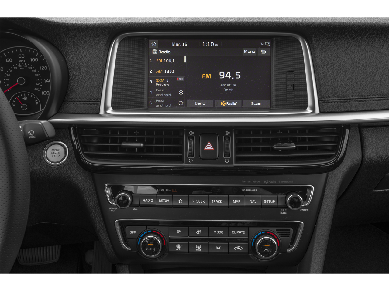 - Radio: harman/kardon AM/FM/MP3/SiriusXM Audio -inc: 630-watts, harman/kardon premium surround sound audio system, 10 speakers including subwoofer, external amplifier, QuantumLogic 7.1 channel surround playback, Clari-Fi digital audio restoration, 8" color touch-screen display, auxiliary input jack, 2 USB chargers, support for Android Auto and Apple CarPlay, Bluetooth® wireless technology w/voice recognition and UVO Link w/navigation